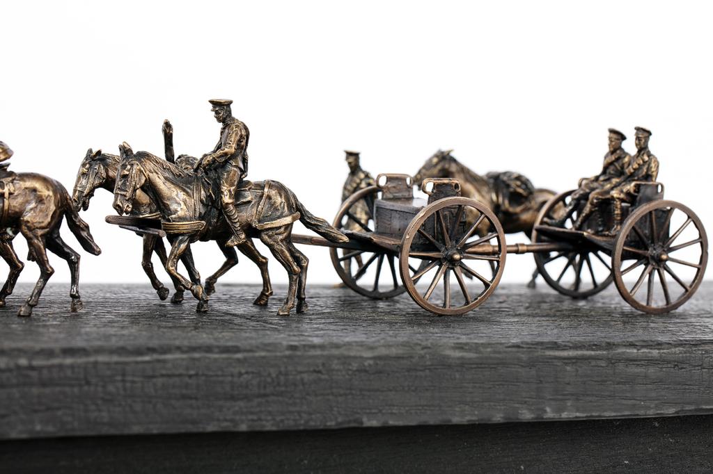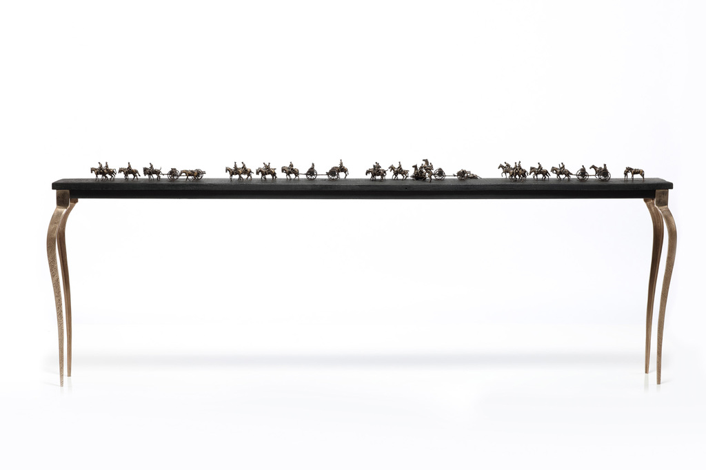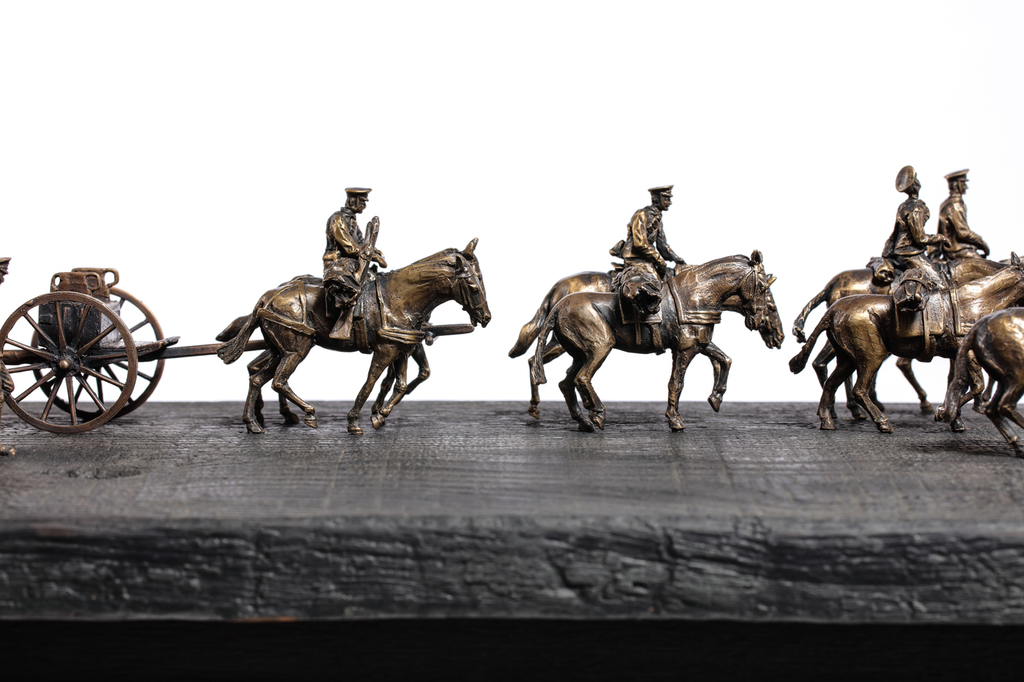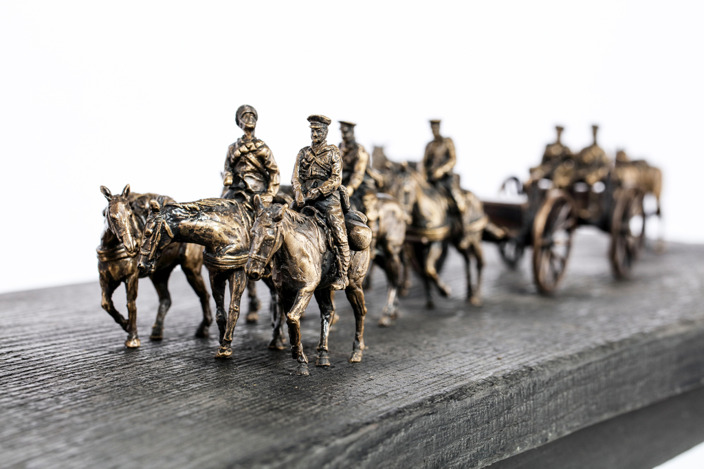 This emotional sculpture depicts a moment in time at the beginning of World War 1. A battery of 13 pounder guns towed by a battle-weary Royal Horse Artillery make their way along the western front in Belgium or France when the convoy is attacked by a shrapnel round, bringing down two horses. The sculpture is permanently attached to the table: the figurines depict people and animals that are a living and dying part of their landscape, some of whom will return to it for sure. Whether any will escape it is not known. The qualities that remain constant about human beings are our drive to build and to craft, and our tendency to destroy ourselves. In this piece I am attempting to articulate both of these qualities. At the same time, the horses (each one unique) measure just 4 inches tall and are set out on a table top in a manner that resembles a diorama of toy soldiers arranged by a child. The thin burnt table is intended to evoke a fragile domesticity where children play with toy soldiers in their first encounter with a repeating violent political reality - one that persists today.