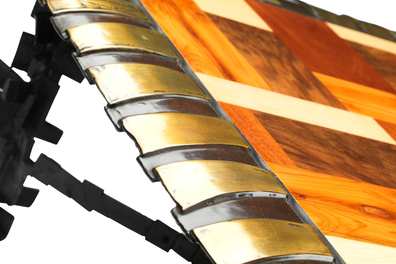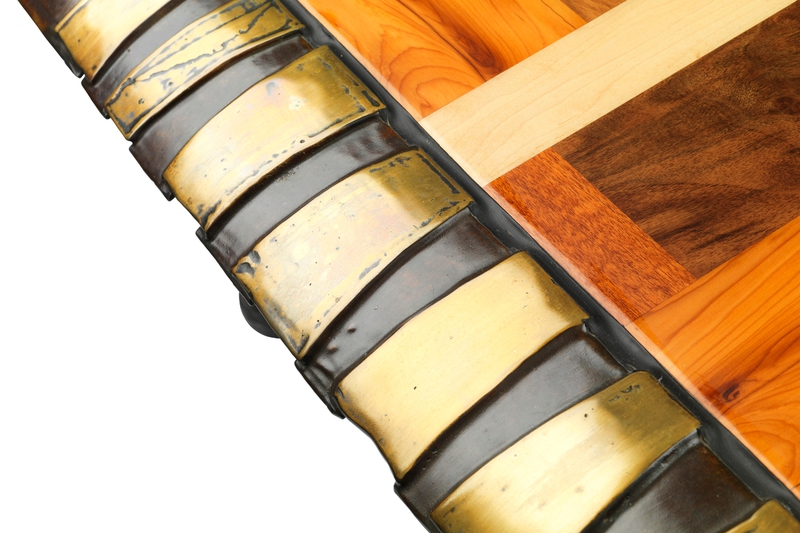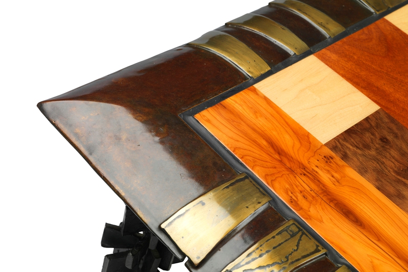 Stretching the use of bronze as a medium this table uses lost wax casting and the wooden top comprises four hardwoods - mahogany, maple, yew and walnut