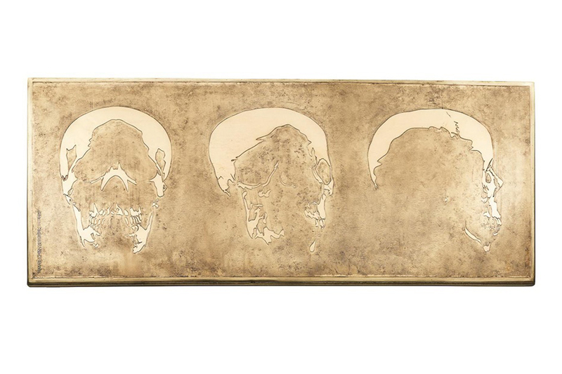 Nick's love for archeology is demonstrated on this stunning table, the surface beneath the polished bronze has been etched away to reveal three skulls with wonderful detail and dynamism. this design can be produced to any size and is also available as a wall or door panel.